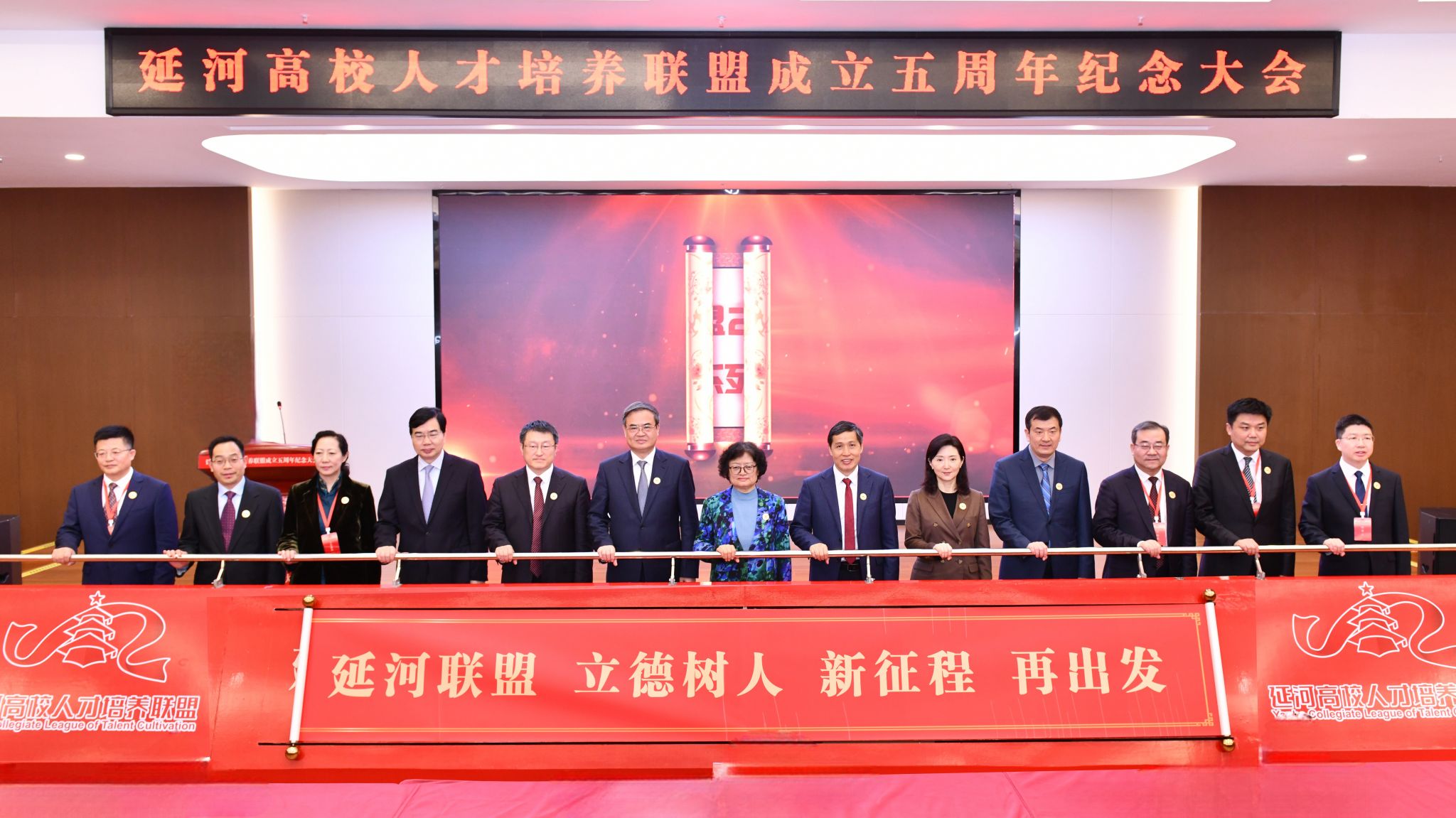 会上举行了“延河联盟”新征程启动仪式。徐海阳与其他联盟高校负责人共同开启巨幅手卷,延河联盟立德树人新征程正式启动。