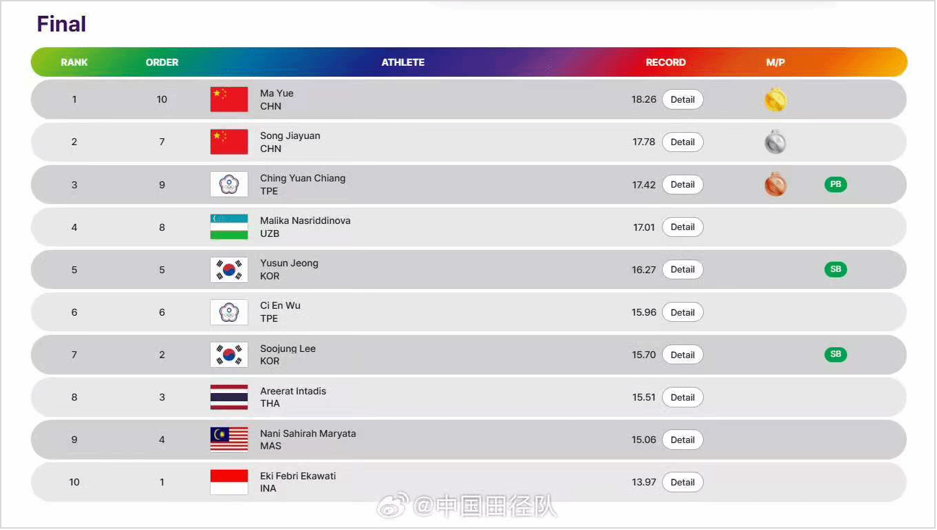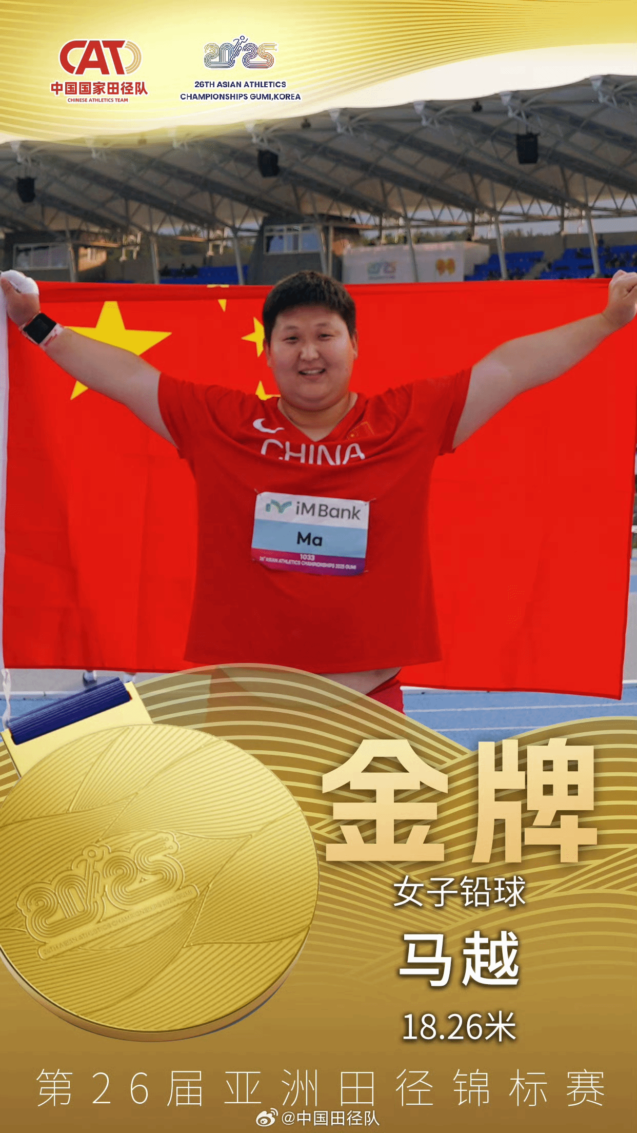 5月30日,在韩国龟尾市举办的第26届亚洲田径锦标赛女子铅球比赛中,我校体育学院2022级硕士研究生马越以18.26米的优异成绩获得金牌。亚洲田径锦标赛是亚洲最高水平的田径赛事,马越此次夺冠,为国家、为学校赢得了荣誉,实现了我校运动员在亚洲田径赛事上的历史性突破。